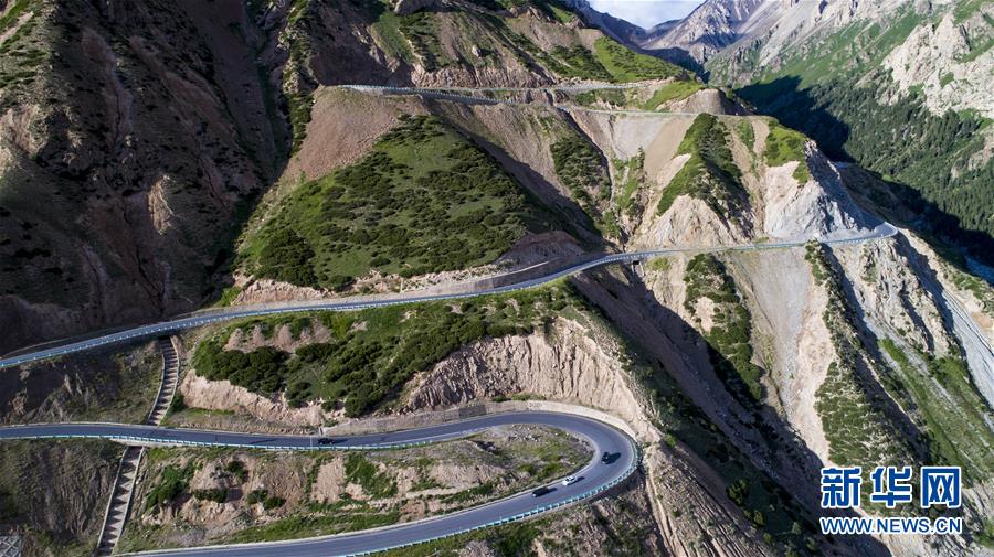 连续转弯的独库公路盘山道(7月15日)。横亘崇山峻岭、穿越深山峡谷的天山公路,北起新疆石油重镇独山子,南至丝路古镇库车,被称为新疆最美公路,是连接南北疆的重要通道。在独库公路修建之前,从独山子到库车需要绕道乌鲁木齐走1000多公里,独库公路开通后省去近一半的路程。它的贯通,堪称中国公路建设史上的一座丰碑。新华社记者江文耀 摄