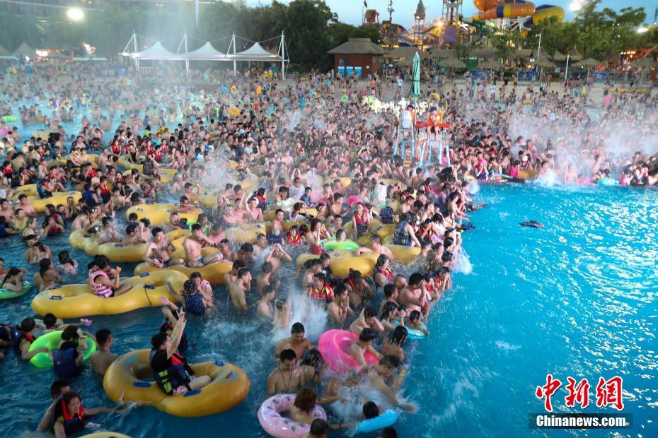 武汉持续高温 水上乐园“人挤人”