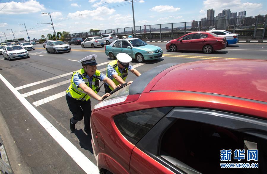 7月19日,武汉大桥大队交警刘升(左)与同事一起将抛锚车辆推离桥面。