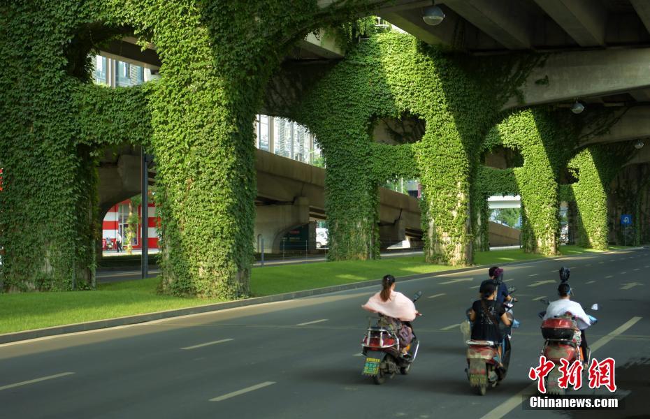 7月20日,四川成都,骑行者穿行在长满绿色植物的二环路高架桥下。该桥因桥墩下种植了攀附力极强的植物“爬山虎”,短短几年时间,桥墩就“穿上了一层绿衣”,二环路也变成了绿色长廊,给炎炎夏日带来丝丝凉意。中新社记者刘忠俊 摄