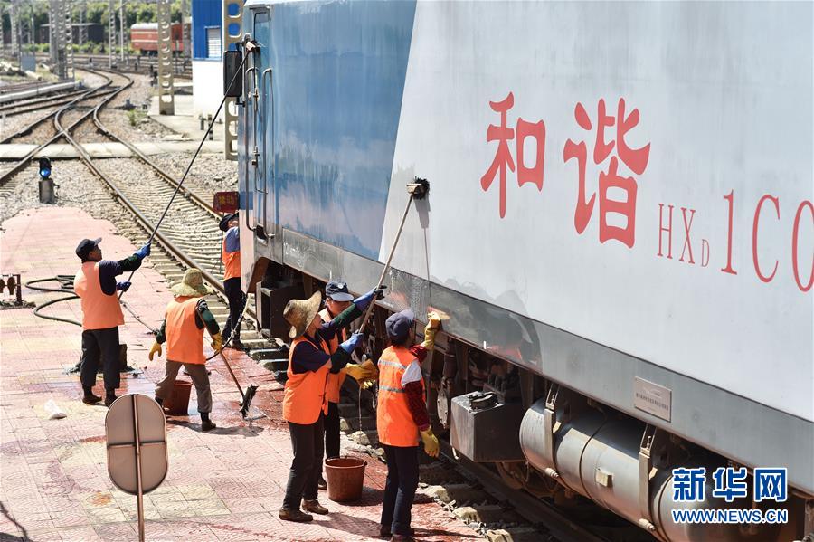 7月20日中午,保洁工人在对火车头进行外部清洗,此时地表温度超过50摄氏度。入伏后的福州,酷热难当。南昌铁路局福州机务段有974名机车清洗、检修人员,他们日日与高温为伴,默默守护着暑运列车的安全运行。据介绍,火车头清洗和检修的部位包括火车头的内部和外部。火车头内部的机械间安装了柴油机、电机等各种设备,这些设备在停转后持续散热,表面最高温度可超过70摄氏度,稍不注意就有被烫伤的可能。由于空气不流通,弥漫着浓重机油味的机械间犹如一个大闷罐,气温接近50摄氏度,用不了多久就浑身湿透。来自闽西山区的清洁工冯新娣说:“我们在给火车头‘洗澡’,也在给自己洗澡”。新华社记者宋为伟 摄