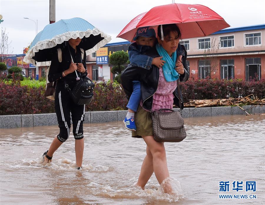 7月20日,在永吉县一拉溪镇,居民行走在积水路段。当日,吉林省吉林市永吉县遭遇强降水,永吉县城区内出现严重内涝。 新华社记者 许畅摄