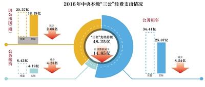 据财政部汇总统计,2016年,中央本级“三公”经费支出48.25亿元,比预算数减少14.85亿元,减少23.5%,比2015年减少5.48亿元,下降10.2%。