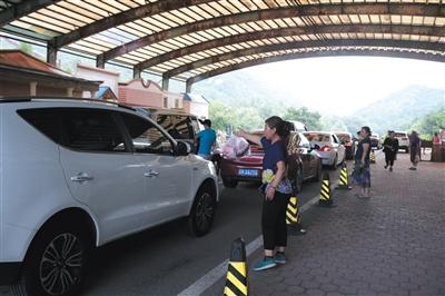 7月15日,自驾游车辆在检票口排起长队,商贩向司机兜售动物食品。新京报记者 朱骏 摄