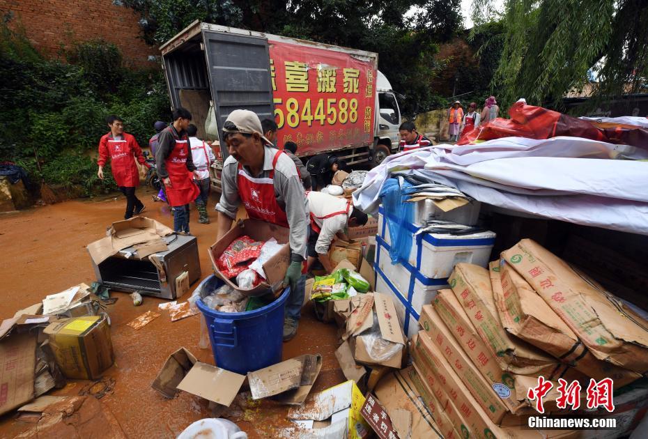 7月23日,停止经营的商家正在搬运物品。昨日,昆明市盘龙区穿金路伍家村段至金殿水库大坝约300米处,距离本月14日发生塌方处附近,因连续几日持续性强降雨再次导致公路边坡、挡土墙塌方,造成穿金路伍家村段交通中断,无人员伤亡。接报后盘龙区政府及时启动应急预案进行除险,各项抢险工作正有序开展。 中新社记者 李进红 摄
