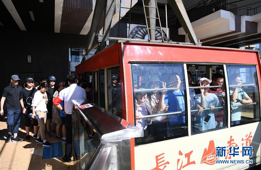 7月23日,游客准备乘坐长江索道。重庆长江索道于2013年末停运进行电气化改造,自2014年元旦重新开放运营以来,其主要功能从城市交通转向旅游观光,受到市民和游客的青睐。截至目前,已累计接待游客800余万人次。重庆长江索道于1987年竣工投入运行,全长1166米,全程运行约5分钟,是我国自行设计制造的长江上第一条大型跨江客运索道。新华社记者王全超 摄