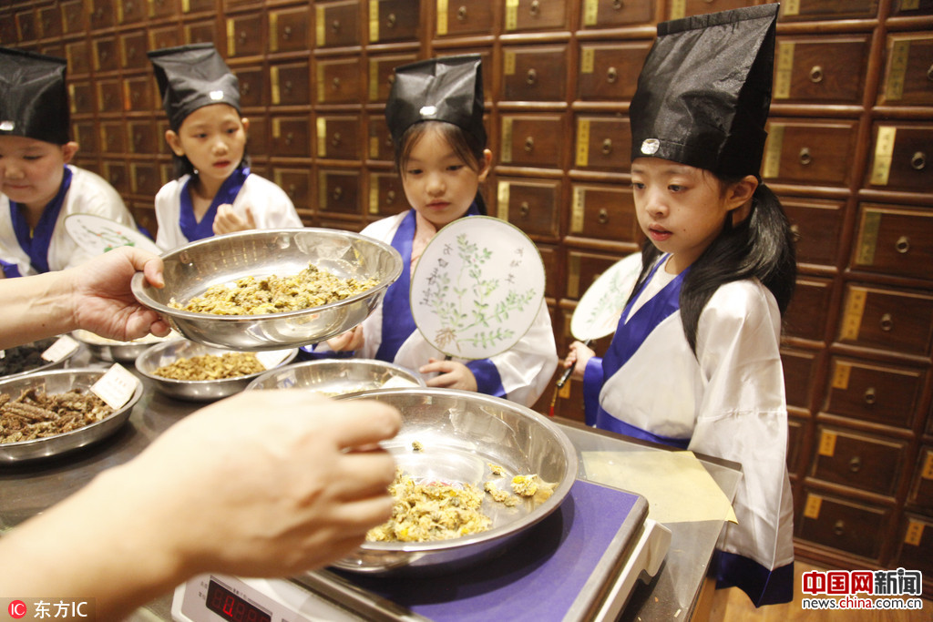 2017年7月24日晚,浙江省杭州市方回春堂桐庐馆内,18名小学生身穿汉服,在专业药师的指导下,学认各种中草药材。今年以来,杭州方回春堂桐庐馆不定期组织小学生开展“认识中草药材 感受中医文化”课外实践活动,让学生们从小认识中草药材,了解中医药知识,体验传统的中医药文化。徐军勇 / 东方IC
