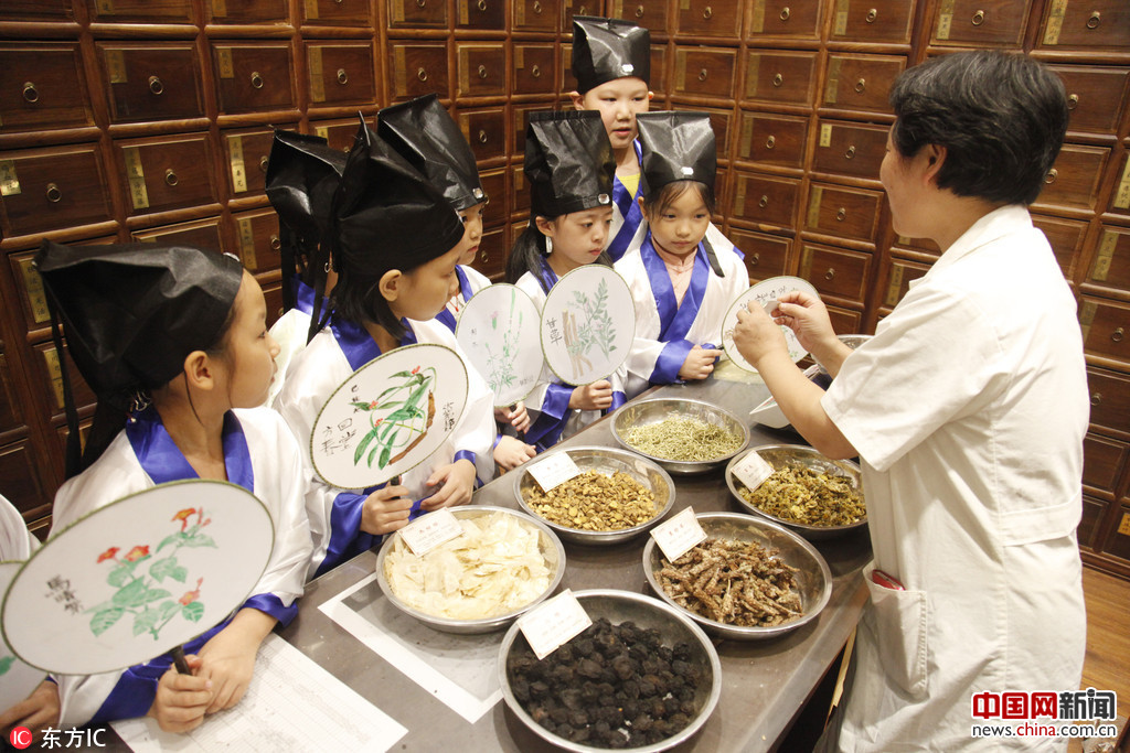 2017年7月24日晚,浙江省杭州市方回春堂桐庐馆内,18名小学生身穿汉服,在专业药师的指导下,学认各种中草药材。