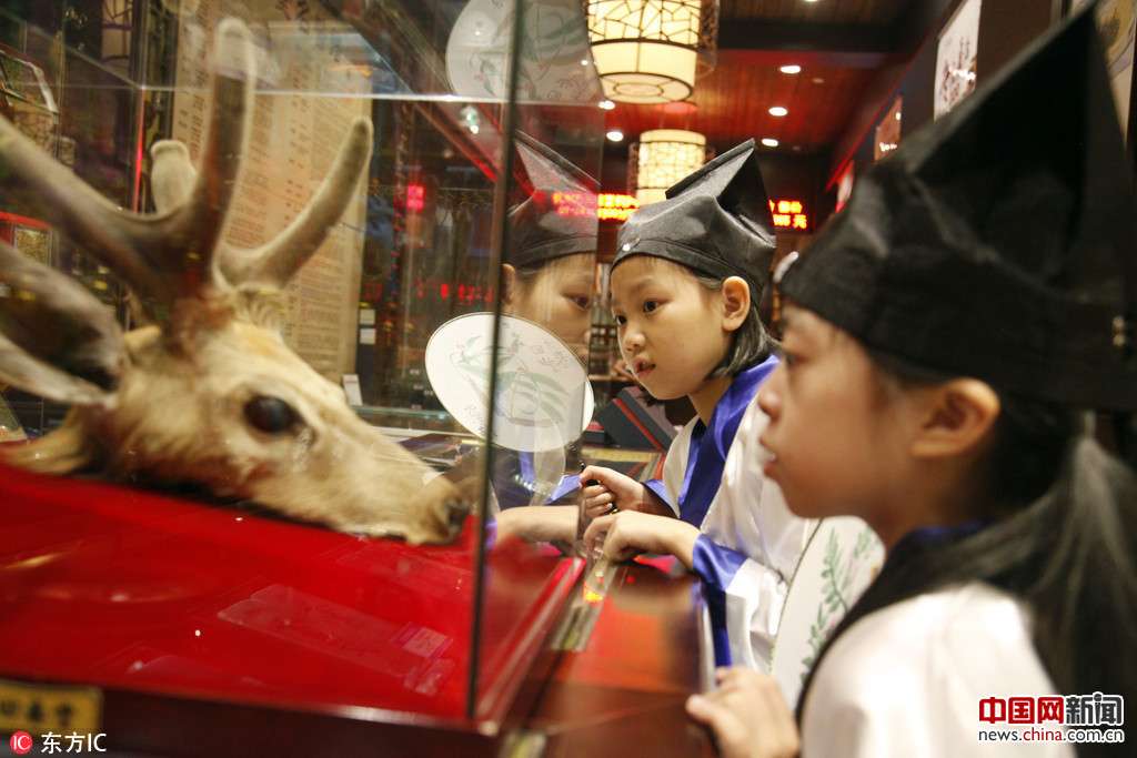 2017年7月24日晚,浙江省杭州市方回春堂桐庐馆内,18名小学生身穿汉服,在专业药师的指导下,学认各种中草药材。