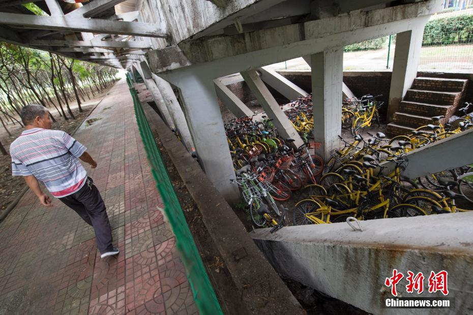 7月25日,山西太原汾河公园,近百辆共享单车被锁放在步行桥下,等待共享单车公司统一运送走。汾河公园内禁止自行车进入,但一些民众随意骑入单车并停放,给工作人员带来很大工作量,将违规单车锁放在桥下也属无奈之举。中新社记者 武俊杰 摄