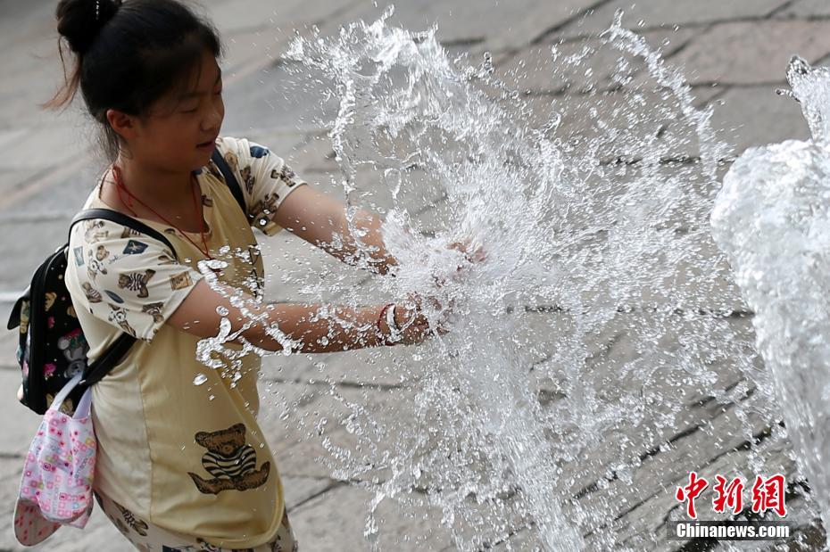 7月25日,市民在南京街头的喷泉处戏水觅清凉。当日,南京市气象台连续第三天发布高温红色预警信号,该市大部分地区最高气温仍达40℃。中新社记者 泱波 摄