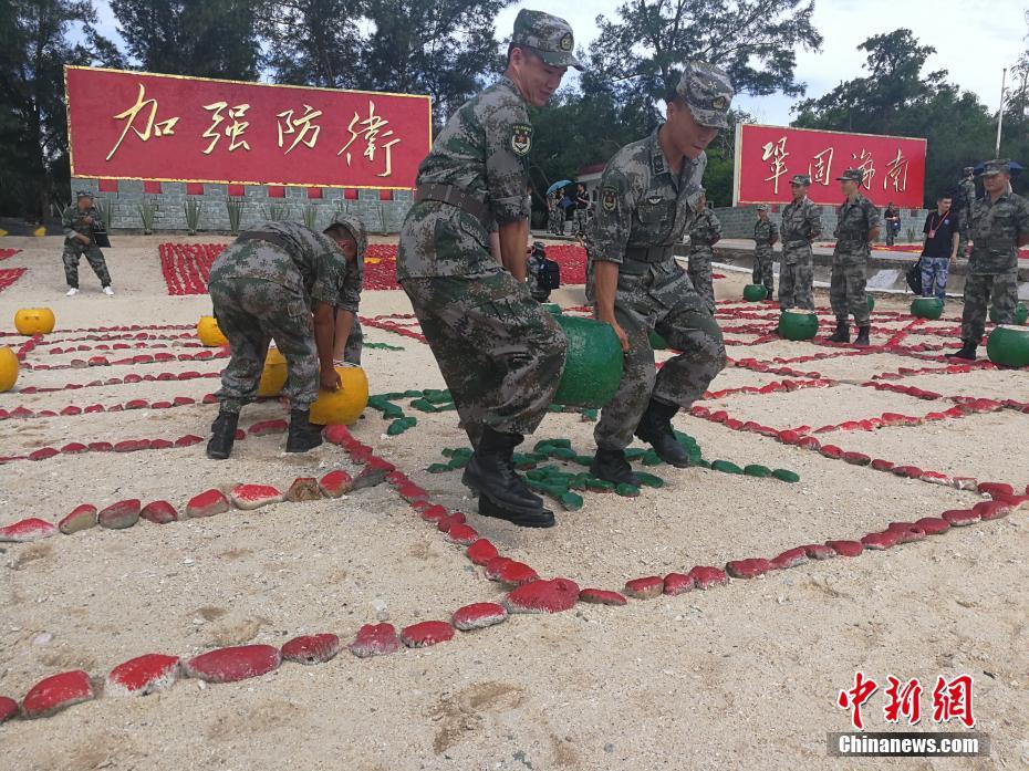 沙滩象棋你玩过吗?驻守在东瑁洲岛的官兵们一年也下不了几次岛,为了丰富连队文化生活,他们想出了不少有趣的活动,包括沙滩象棋、椰子保龄球等等。下沙滩象棋时,两名棋手站在梯子上指挥,棋盘上每两名战士抬一个棋子。据介绍,每颗棋子都重达40公斤,没有好体能还真下不了这盘棋呢!中新网记者 张尼 摄
