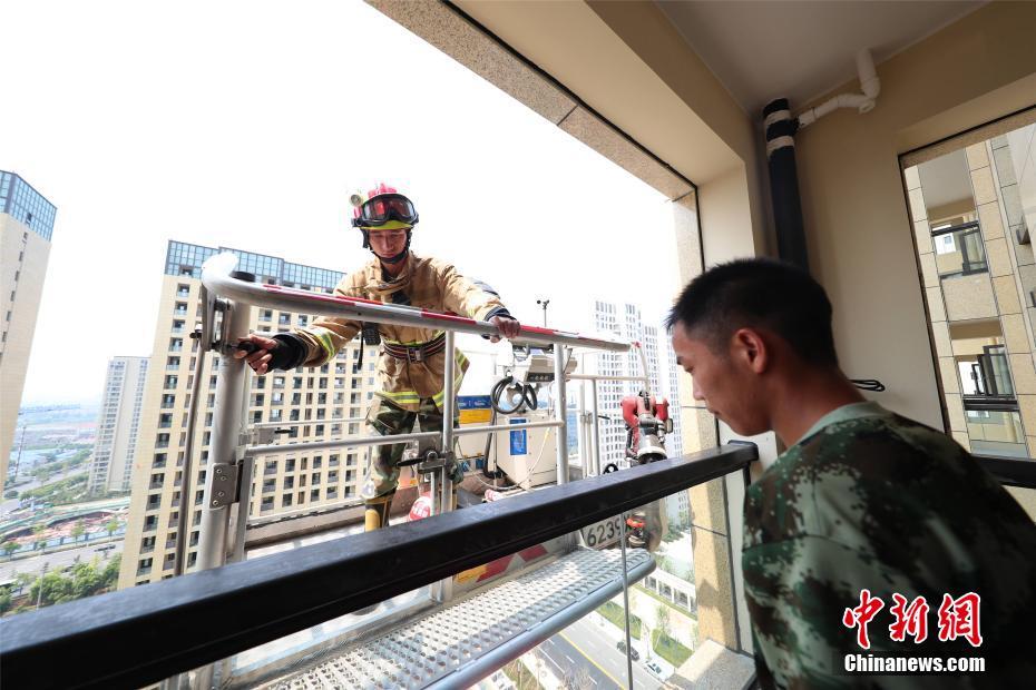 浙江消防模拟高层扑救训练 负重70斤爬20楼