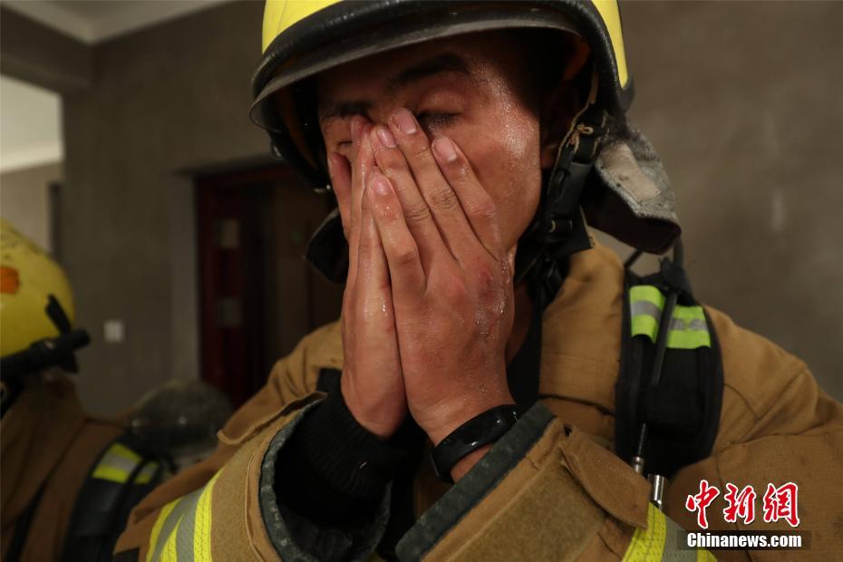7月26日,一名消防员负重70斤登楼后汗流不止。当天,浙江宁波消防部门模拟高层火灾实战扑救训练,40摄氏度高温下,消防官兵负重70斤爬到20楼救援。中新社记者 颜杰 摄
