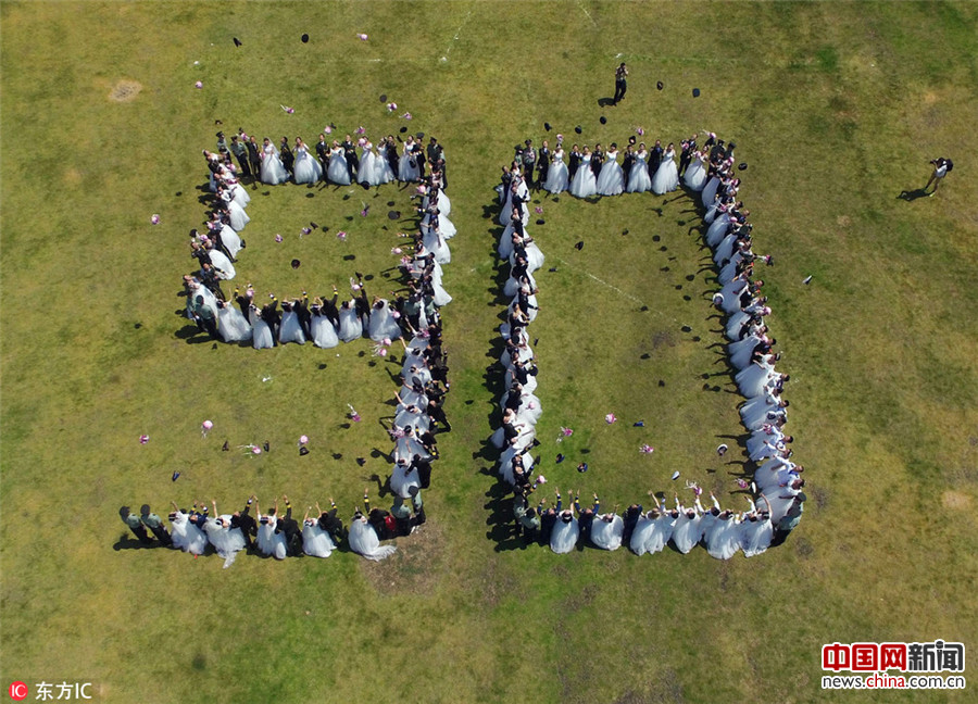 五角星造型后,新人们又改变队形,形成90造型,庆祝八一建军90周年。葛跃进/东方IC 摄
