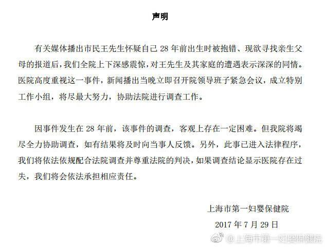 近日,有媒体报道,王先生怀疑自己28年前出生时被抱错、现欲寻找亲生父母的事件,引起社会关注。今天(7月29日),上海市第一妇婴保健院官方微博发布声明,医院已成立特别工作小组,尽最大努力,协助法院进行调查工作,并称“如果调查结果显示医院存在过失,我们将会依法承担相应责任”。