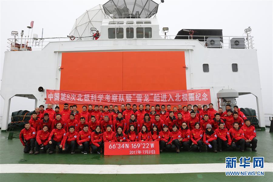 7月31日,科考队员在“雪龙”号直升机停机坪合影纪念穿越北极圈。北京时间7月31日上午8时50分,“雪龙”号从北纬66°34′、西经169°22′穿越北极圈,进入北冰洋。新华社记者 郁琼源 摄 图片来源:新华网