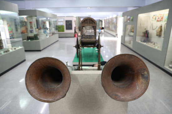 博物馆内陈列巨大的法号。本报记者卢冶摄