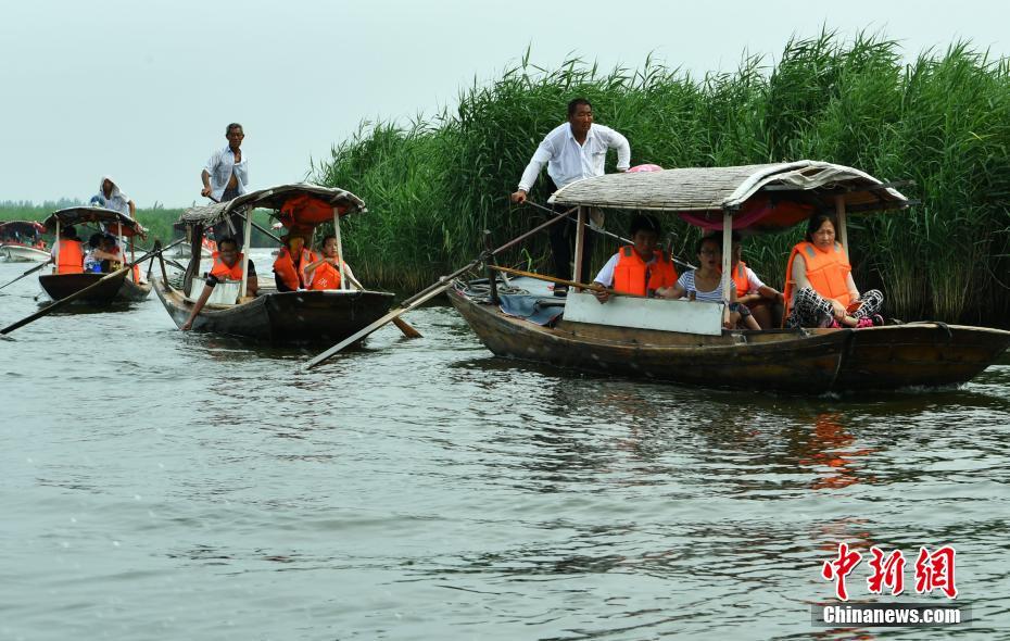 8月2日,位于雄安新区的“华北明珠”白洋淀游人如织。据了解,目前正值白洋淀最美季节,淀内苇绿荷红,360余种中外荷花吸引着各地的游客。图为游客乘船在成片的芦苇荡中穿行。中新社记者翟羽佳 摄