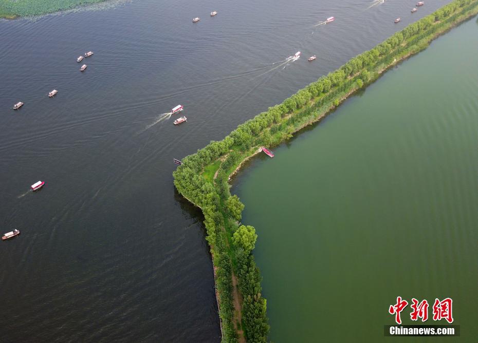 8月2日,位于雄安新区的“华北明珠”白洋淀游人如织。据了解,目前正值白洋淀最美季节,淀内苇绿荷红,360余种中外荷花吸引着各地的游客。图为航拍白洋淀。中新社记者翟羽佳 摄