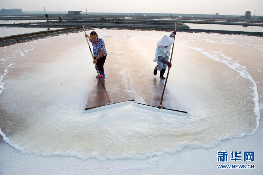 8月6日,山腰盐场的盐工在用传统的盐耙扒收海盐。 新华社记者姜克红摄