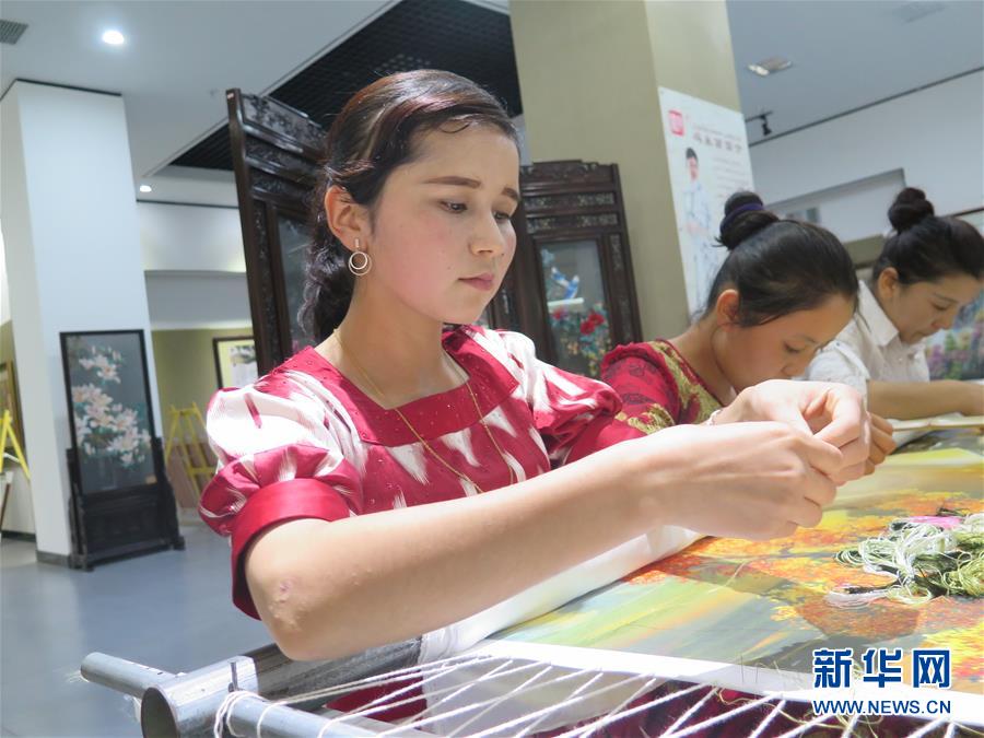 在位于新疆库车县经济技术开发区的河南安绣文化产业有限公司,热孜宛古丽·赛买提在整理丝线(8月5日摄)。