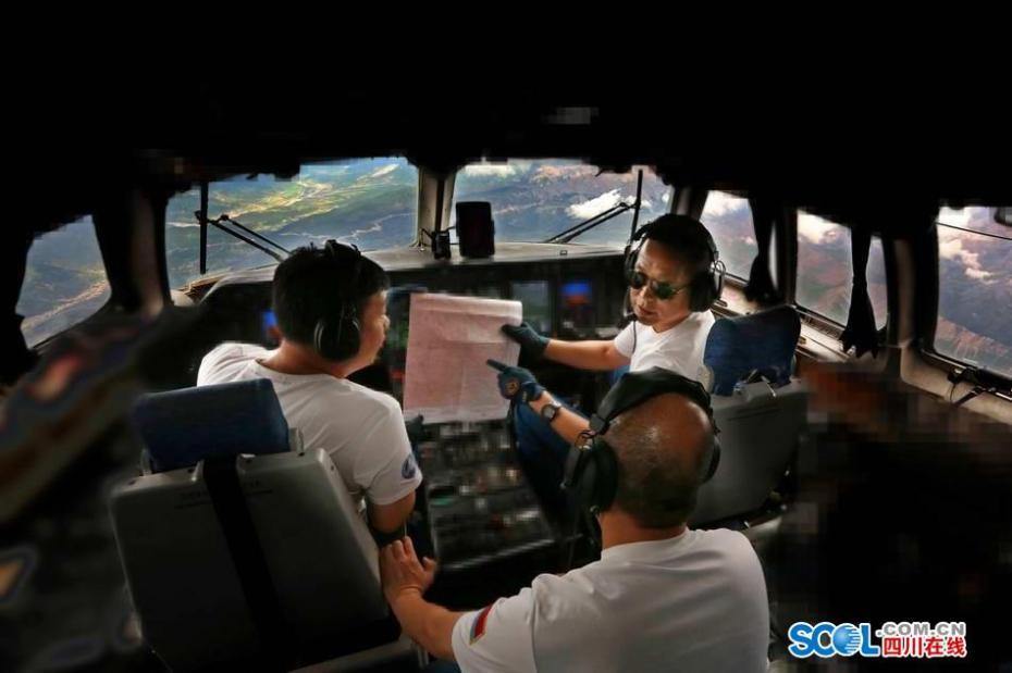 8月10日,西部战区空军再次出动运-9飞机,飞赴九寨沟地震灾区,重点对九寨沟各沟重要景点和区域进行精准航空侦察。在6000米高空俯瞰,被不少游客称为“恋人”的九寨沟依然美丽,看,连绵的青山秀丽依旧,散落的海子清亮的眸子,依然幽蓝清澈,神奇的九寨,依然是看得到的天堂。图为机长、航空兵某团副团长杨宝平与机组人员在九寨沟上空分析经纬度。(文/张立东 摄影 /刘应华 刘畅 )图片来源:四川在线