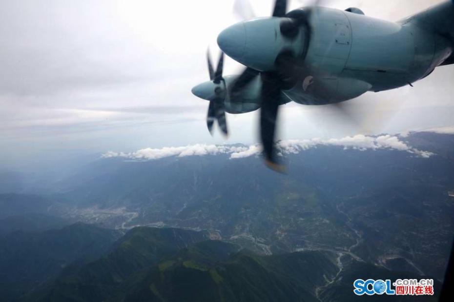8月10日,西部战区空军再次出动运-9飞机,飞赴九寨沟地震灾区,重点对九寨沟各沟重要景点和区域进行精准航空侦察。在6000米高空俯瞰,被不少游客称为“恋人”的九寨沟依然美丽,看,连绵的青山秀丽依旧,散落的海子清亮的眸子,依然幽蓝清澈,神奇的九寨,依然是看得到的天堂。图为运-9飞机飞抵九寨沟县空域,开始实施航空侦察作业。(文/张立东 摄影 /刘应华 刘畅 )图片来源:四川在线