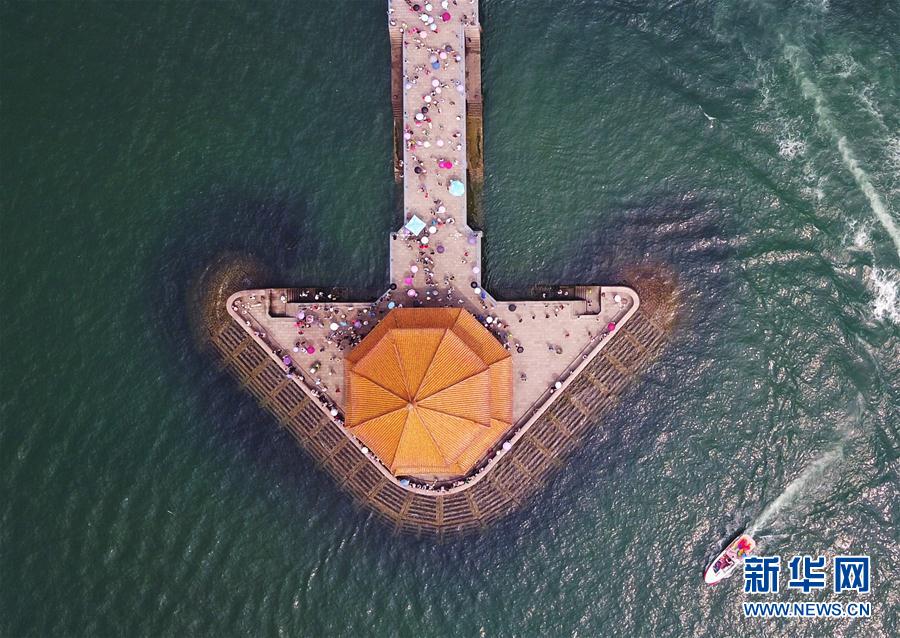 这是8月10日航拍的青岛栈桥。时下,青岛正值暑期旅游旺季,栈桥游人如织,日均接待8万多人次。 新华社记者 王建华 摄