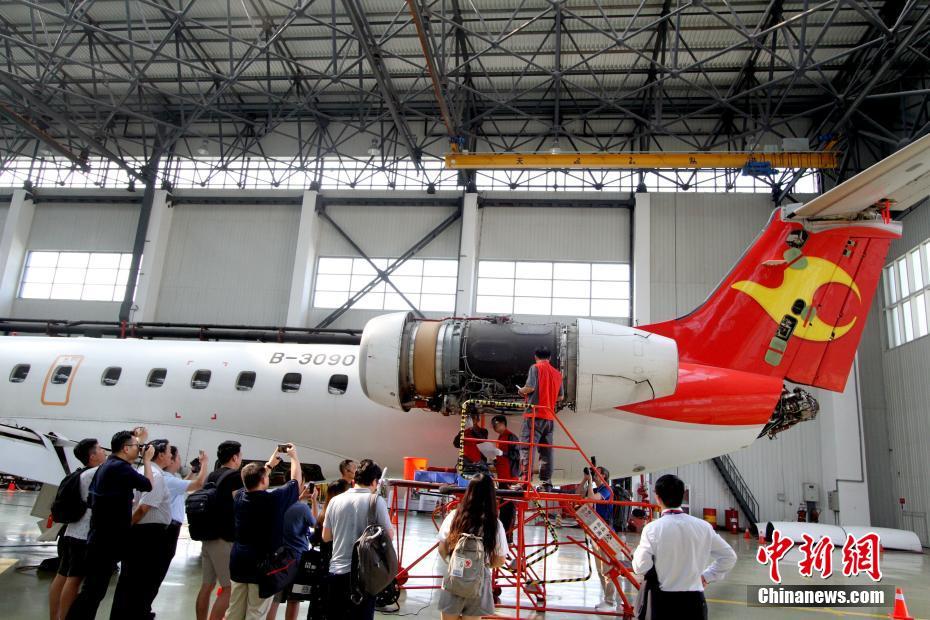 8月10日,天津市,海航集团旗下天津航空有限责任公司举办了2017年的第一期开放体验日活动。通过对外开放航空公司的“中枢大脑”——AOC运行控制中心及“飞机医院”——飞机维修机库,向旅客代表、航空爱好者、市民代表展示了航空公司航班运行背后那些鲜为人知的故事。图为社会各界代表围观正在检修的飞机。中新社记者 张道正 摄