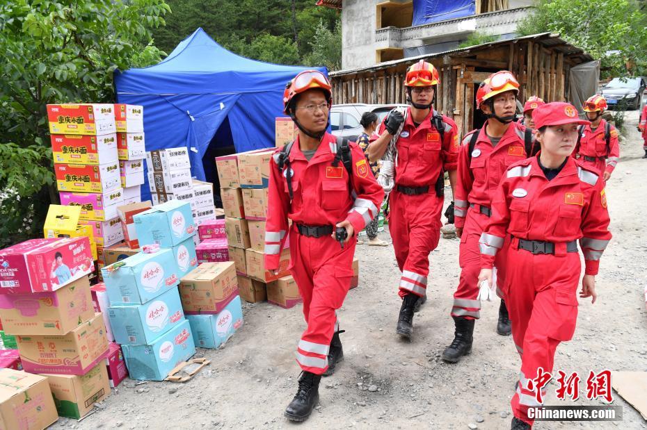 8月10日,中国国际救援队分四组深入九寨沟灾区采取地毯式搜索排查。在漳扎镇扎如村,救援队员给当地村民送来了急需药品,并对九寨沟山体滑坡险段进行重点排查。中新社记者 陈文 摄