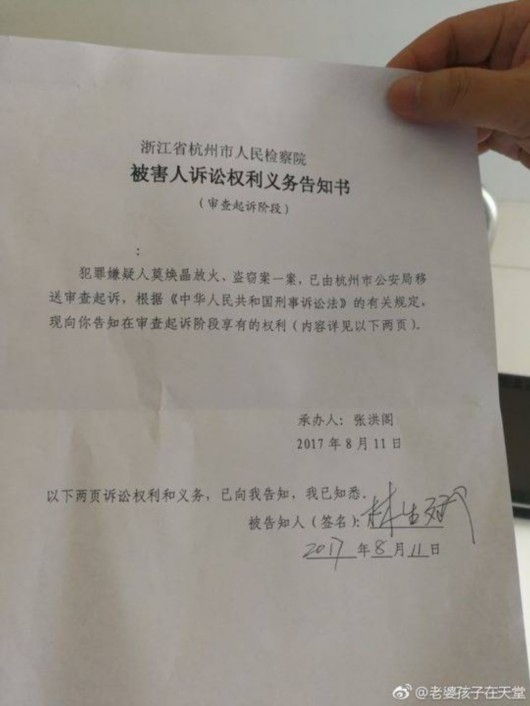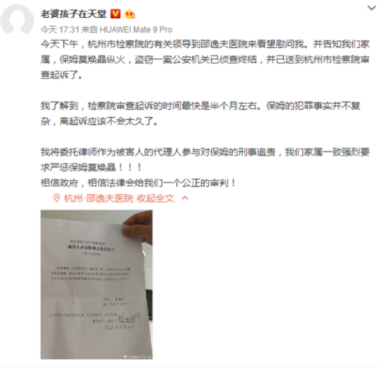 今天下午,杭州市检察院的有关领导到邵逸夫医院来看望慰问我。并告知我们家属,保姆莫焕晶纵火,盗窃一案公安机关已侦查终结,并已送到杭州市检察院审查起诉了。