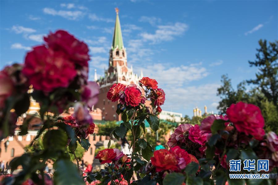 这是2017年7月19日在俄罗斯莫斯科拍摄的克里姆林宫外盛开的鲜花。