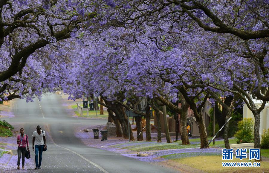 这是2014年10月15日,在南非比勒陀利亚,行人从蓝花楹树下走过。每年十月,种植有八万多株蓝花楹树的比勒陀利亚都会成为一片紫色的海洋,故有“蓝花楹之城”美誉。