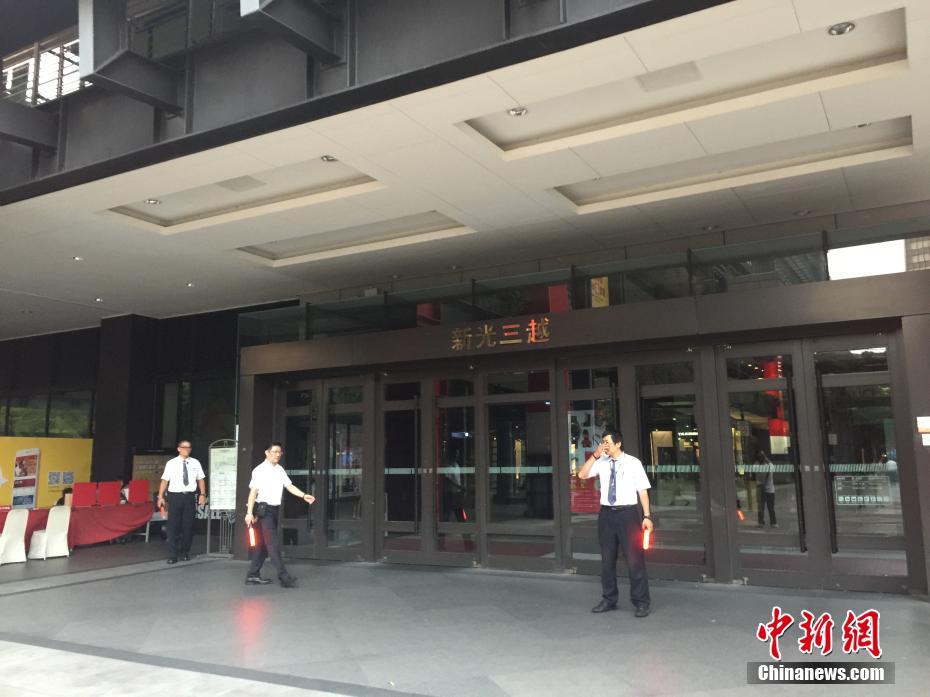 8月15日下午,台电公司大潭电厂6部机组跳脱,供电容量减少约400万千瓦,导致全台湾17个县市陆续传出无预警停电意外,668万户受影响。图为台北市最繁华的信义商圈的大型商场停电,商场将顾客全部疏散,工作人员站在门口,将商场暂时关闭。中新社记者 路梅 摄