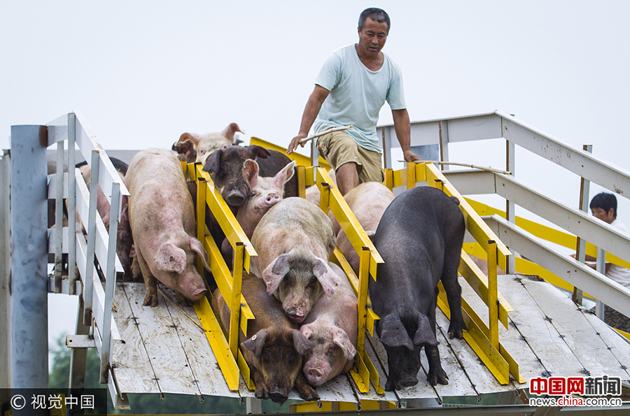 一位双手持棍的饲养员,欲将眼前的两头肉食猪踹下跳台。图片来源:视觉中国
