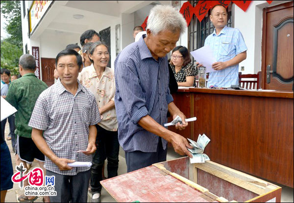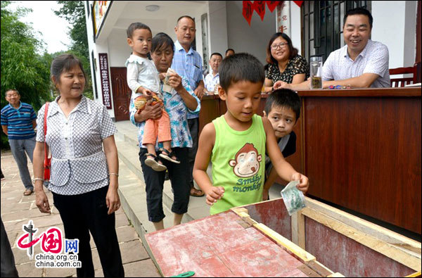 20元,50元,100元,200元……村民们有序地排着长队,面额不等的钞票从他们手中不断投入到捐款箱中。
