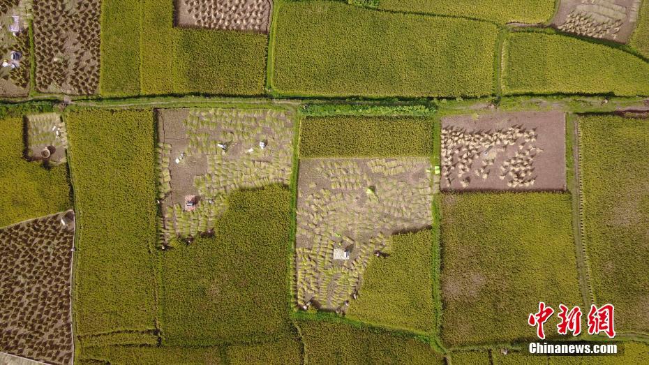 8月17日,初秋时节,地处金沙江干热河谷的云南牟定县羊旧村水稻成熟,金黄的大地描绘出一幅丰收的画卷。中新社记者 刘冉阳 摄