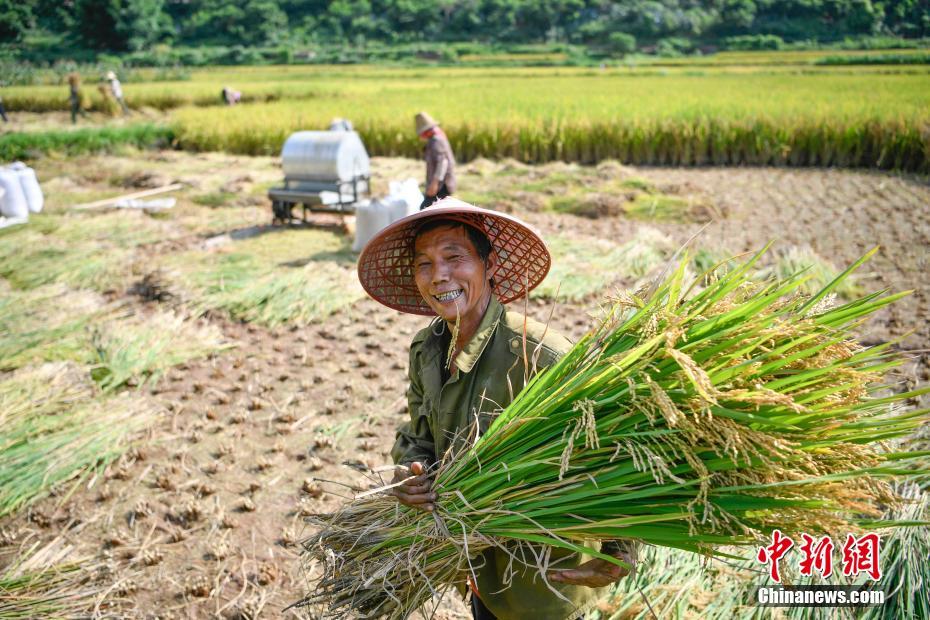 8月17日,村民手捧水稻笑容满面。初秋时节,地处金沙江干热河谷的云南牟定县羊旧村水稻成熟,金黄的大地描绘出一幅丰收的画卷。中新社记者刘冉阳 摄