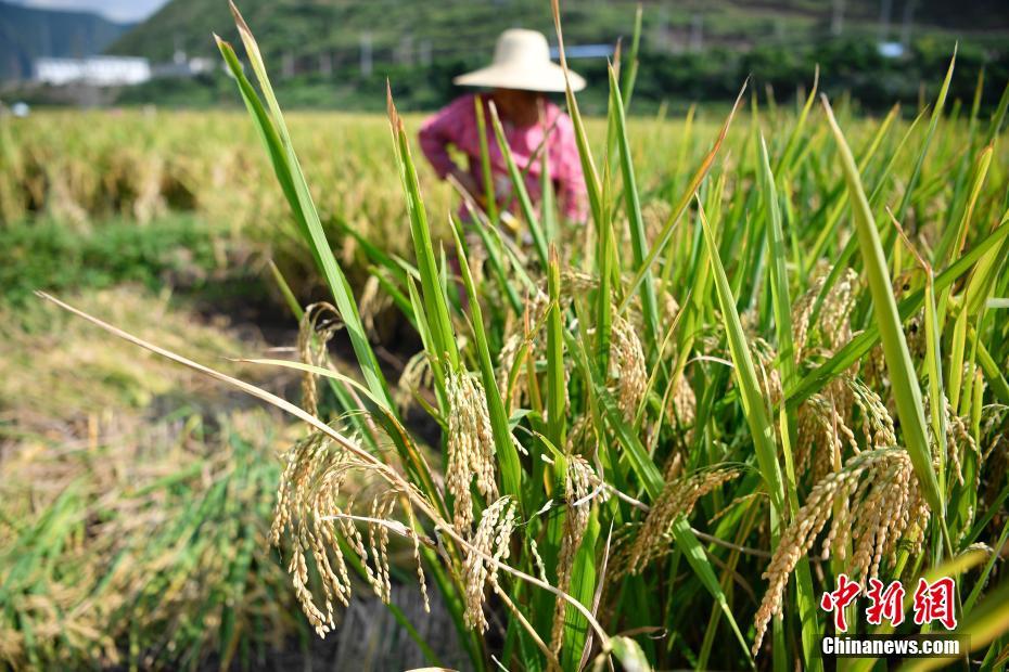 8月17日,丰收的水稻。初秋时节,地处金沙江干热河谷的云南牟定县羊旧村水稻成熟,金黄的大地描绘出一幅丰收的画卷。中新社记者 刘冉阳 摄