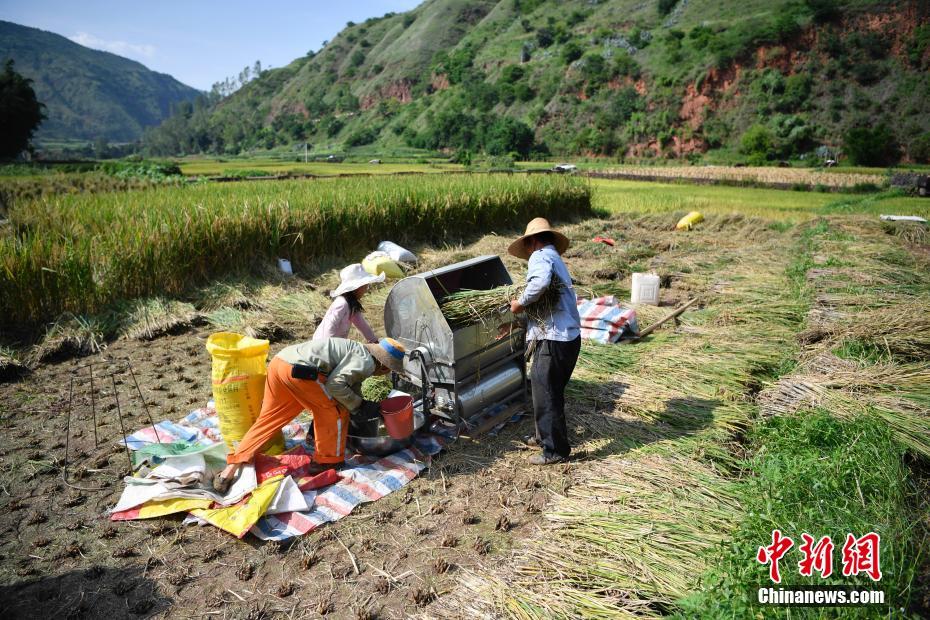 8月17日,村民在稻田里打谷。初秋时节,地处金沙江干热河谷的云南牟定县羊旧村水稻成熟,金黄的大地描绘出一幅丰收的画卷。中新社记者 刘冉阳 摄