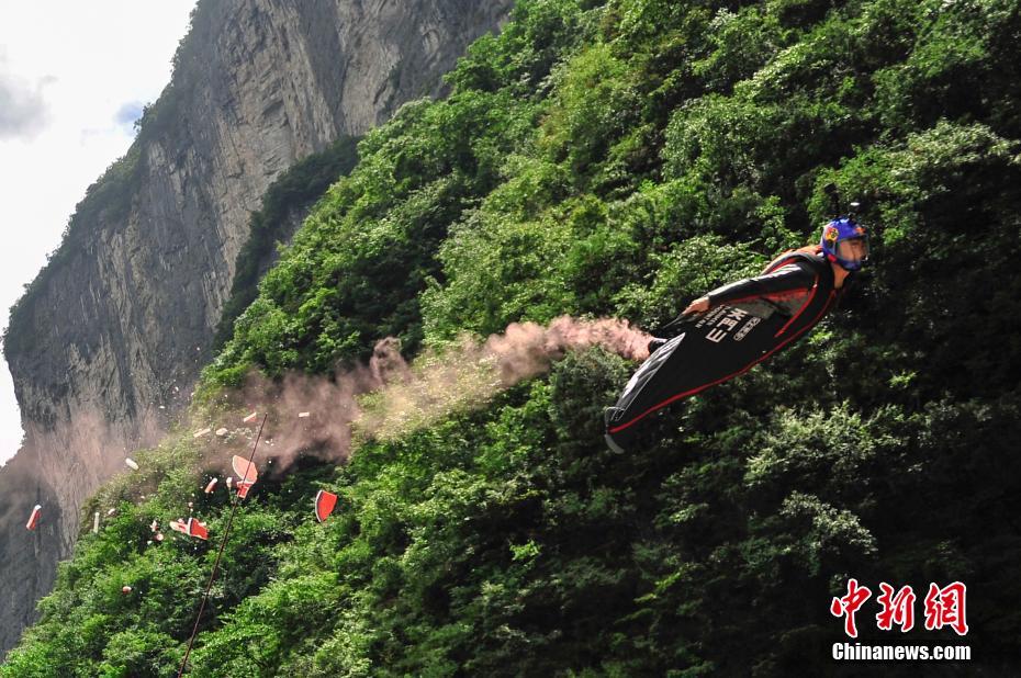 8月17日,中国翼装飞行员张树鹏从天门山鲲鹏顶起跳,以近200公里的时速,成功穿击在山路上行驶的汽车顶部移动靶标。据悉,靶心距离车顶仅5米,该挑战系翼装飞行史上首次。图为中国翼装飞行员张树鹏成功穿击移动靶。向韬 摄