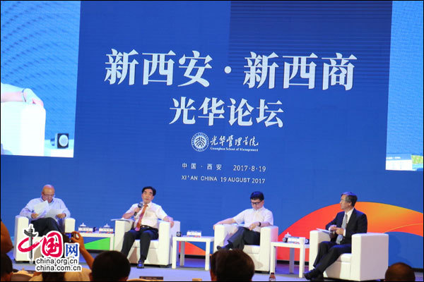 中国网8月20日讯 8月19日下午,首届全球西商大会系列活动之一的“新西安•新西商”光华论坛在西安举行。本次论坛以“理解‘新西商’内涵、激发‘新西商’活力、传承‘新西商’精神”为主题,来自国内外学术专家、各类领军人才、金融投资机构代表约350人参会。陕西省委常委、西安市委书记王永康致辞。北京大学原副校长、经济与管理学部主任张国有,北京大学经济政策研究所所长、光华管理学院教授陈玉宇,中国平安集团总经理任汇川,武岳峰资本创始合伙人武平,爱国者集团董事长冯军等作主题演讲。