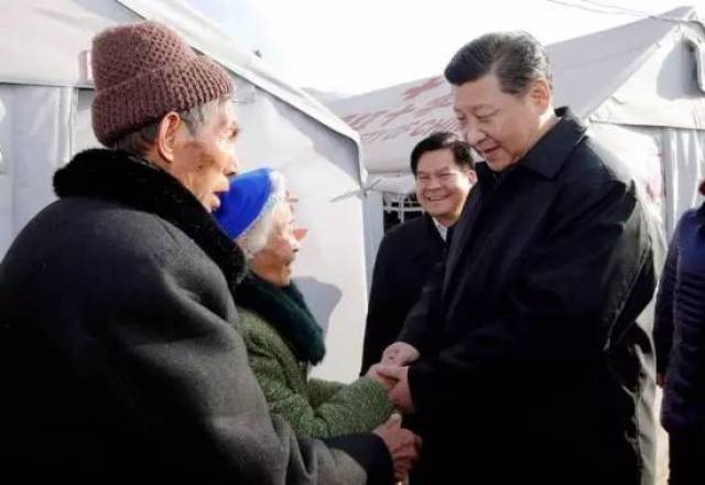 2015年1月19日,习近平来到云南省鲁甸县小寨镇甘家寨红旗社区过渡安置点,看望地震灾区群众 新华社记者 鞠鹏 摄