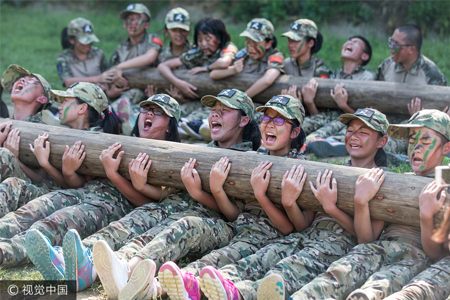2017年8月18日,杭州一初中新生接受“战狼式”军训,环抱200斤圆木仰卧起坐。(陈中秋/视觉中国)