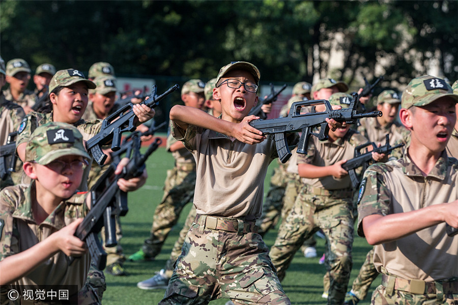 2017年8月18日,杭州一初中新生接受“战狼式”军训,刺杀训练。(陈中秋/视觉中国)