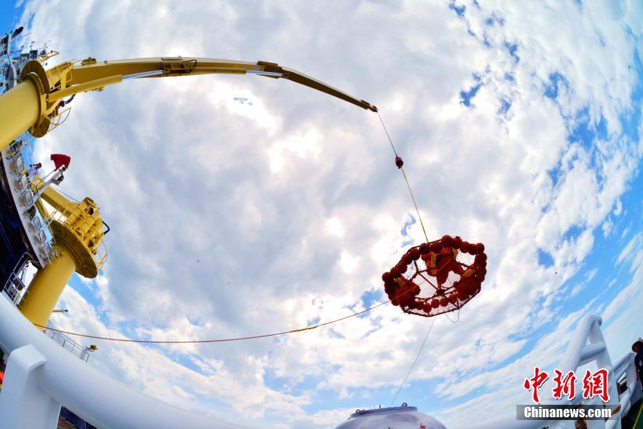 16名中国航天员和2名欧洲航天员,8月21日在山东省烟台市附近海域圆满完成了为期17天的海上救生训练任务。图为训练期间,8月2日,甲板上的机械吊臂把救生吊篮起吊入水。中新社发 朱九通 摄