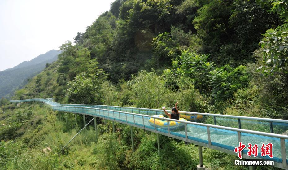 8月21日,河北灵寿县一景区高空玻璃漂流正式向游人开放。该高空玻璃漂流全长1260米,上、下站水平距离780米,落差100米,途中5个360度回转,20米地下水道,设计独特,盘居在景区中央群峰之中。中新社记者 韩冰 摄