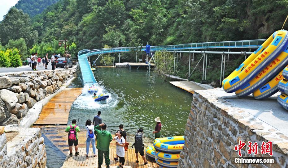 8月21日,河北灵寿县一景区高空玻璃漂流正式向游人开放。该高空玻璃漂流全长1260米,上、下站水平距离780米,落差100米,途中5个360度回转,20米地下水道,设计独特,盘居在景区中央群峰之中。图为高空玻璃漂流终点。中新社记者 韩冰 摄