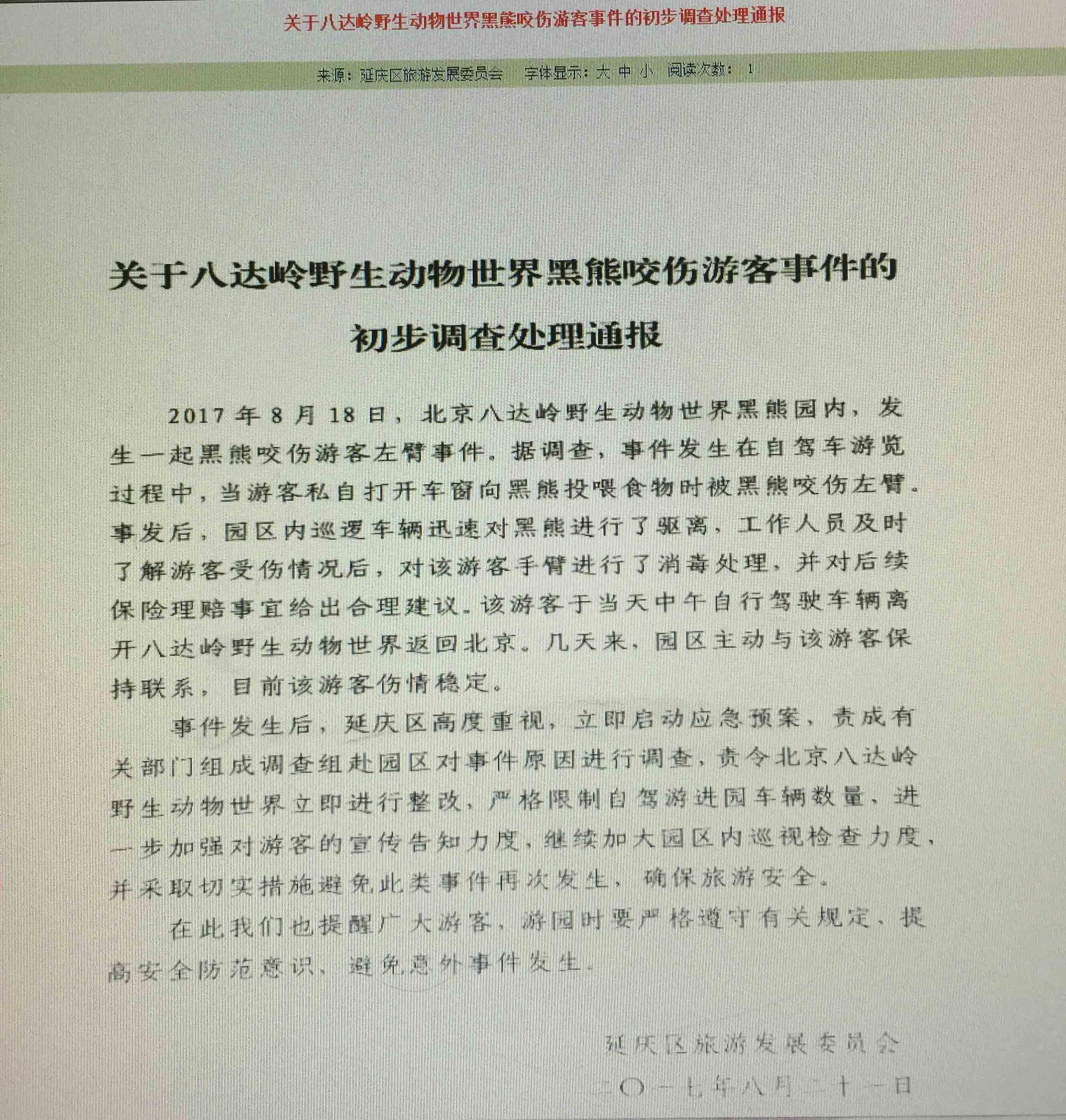 8月18日,北京八达岭野生动物世界发生黑熊咬伤游客事件。21日晚,延庆区旅游委官网公布了此次事件的初步调查处理结果。